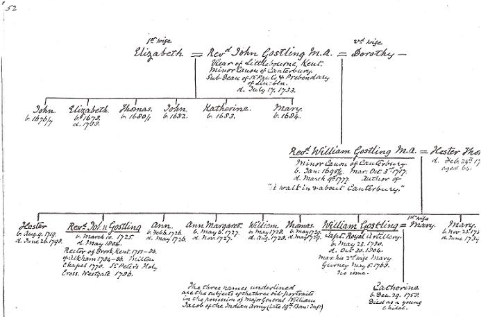 There are three old oil paintings, portraits of Reverend William Gostling, minor canon of Canterbury, and his two sons, Reverend John Gostling and Captain William Gostling, which came from your father's side of the family, and I have in vain tried to find out whether there was any connection between the Gostlings and Jacobs or the Legrands.